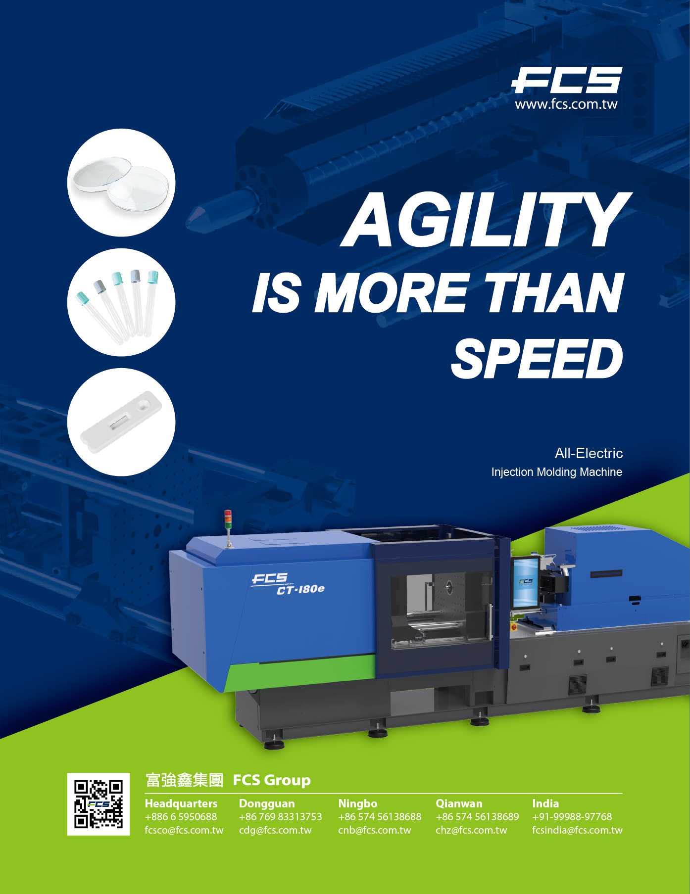 Máy ép phun điện hoàn toàn dòng CT-e là mẫu máy mới ra mắt của FCS. Các ngành công nghiệp ứng dụng bao gồm bao bì, linh kiện quang học, y tế và thiết bị 3C như máy tính xách tay hoặc linh kiện máy in đa chức năng, v.v. Lực kẹp từ 50 tấn đến 1.100 tấn.