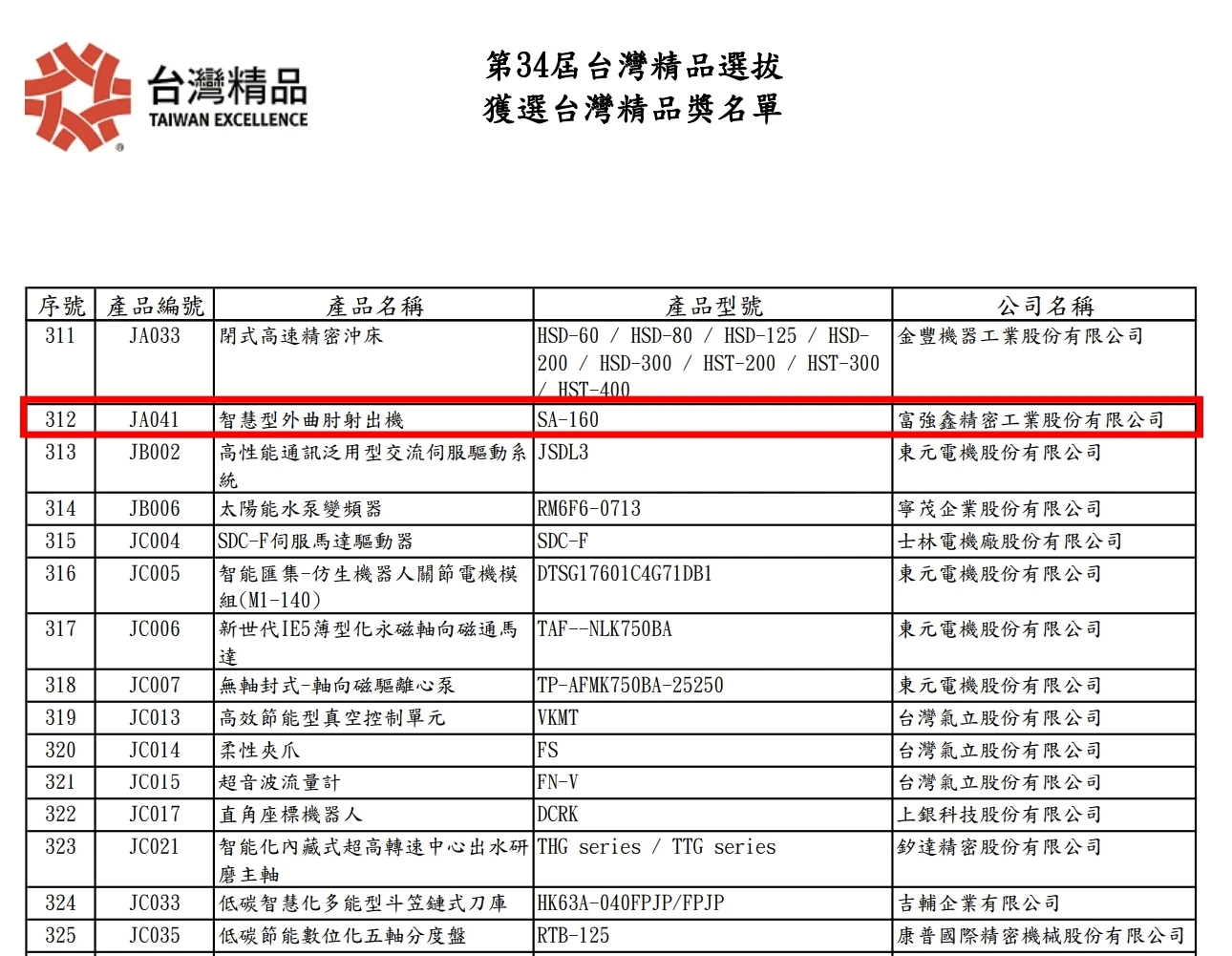 Tập đoàn FCS thông báo Máy ép phun trục ngoài thông minh SA-160 của công ty đã vinh dự nhận được "Giải thưởng Xuất sắc Đài Loan" lần thứ 34. Giải thưởng này do Bộ Kinh tế chủ trì và TAITRA tổ chức, nhằm ghi nhận những sản phẩm vượt trội về thiết kế sáng tạo, hiệu suất, chất lượng và khả năng cạnh tranh trên thị trường, đồng thời được coi là danh hiệu cao quý nhất tượng trưng cho sự xuất sắc trong các sản phẩm Sản xuất tại Đài Loan (MIT).