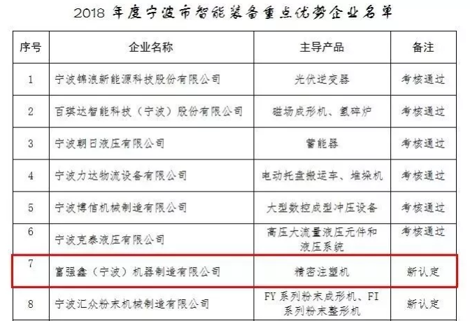 Mới đây, Văn phòng Nhóm Lãnh đạo Thúc đẩy chương trình "Sản xuất tại Trung Quốc 2025" tại Ninh Ba đã công bố danh sách các doanh nghiệp chủ chốt có lợi thế cạnh tranh trong ngành thiết bị thông minh của Ninh Ba năm 2018. Công ty TNHH Sản xuất Máy móc Fuqiangxin (Ningbo) (sau đây gọi tắt là "Fuqiangxin") được chọn là một trong những doanh nghiệp có lợi thế cạnh tranh mới được công nhận (tổng cộng 7 doanh nghiệp), và cũng là doanh nghiệp duy nhất tại quận Giang Bắc được công nhận lần này.